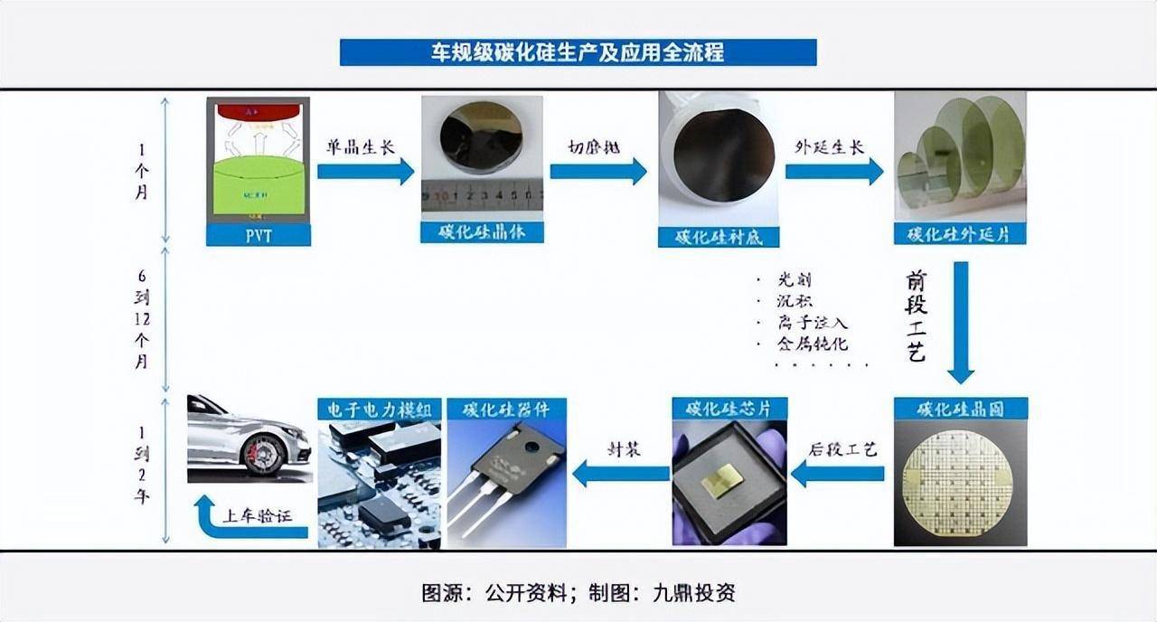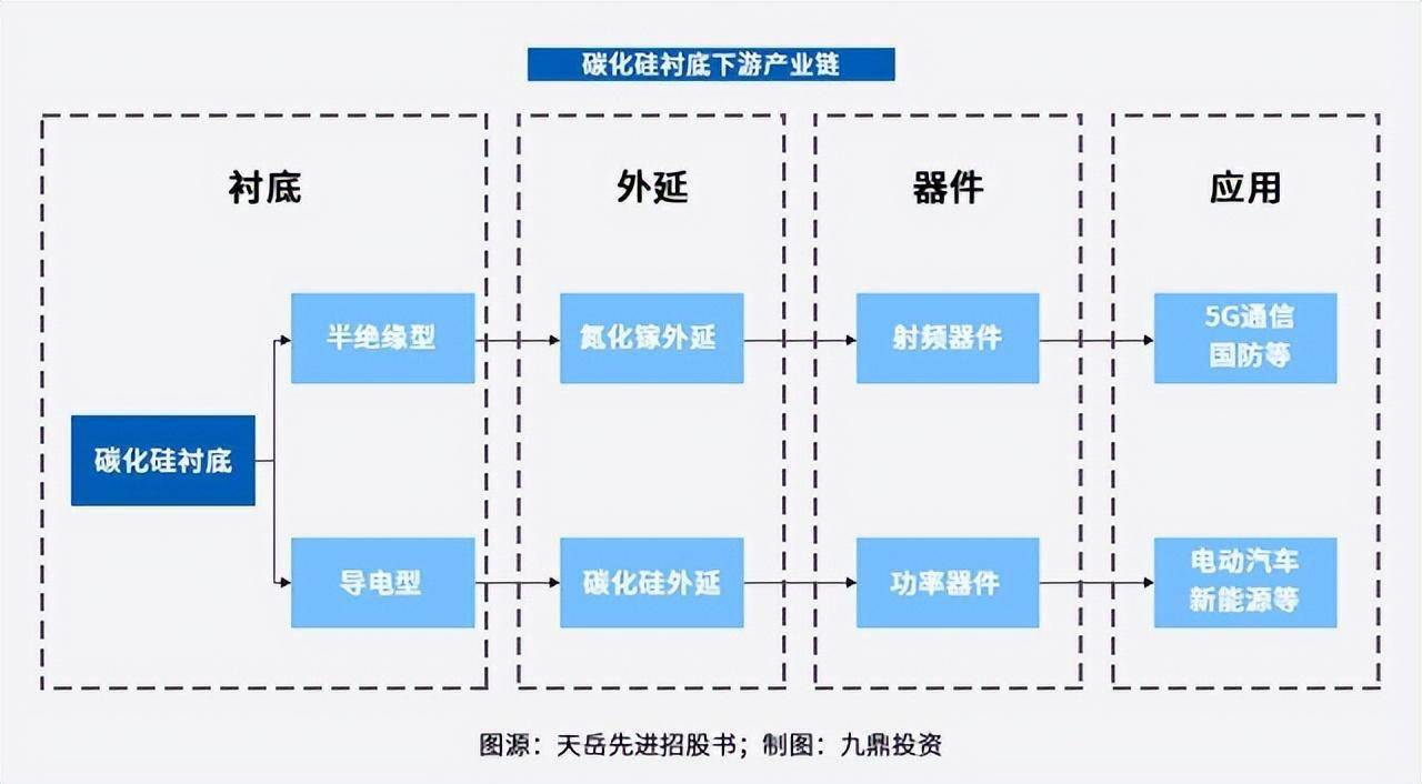 在碳化硅产业链上游,九鼎投资认为,衬底和外延材料生产商,以及相关的设备制造商均值得关注。