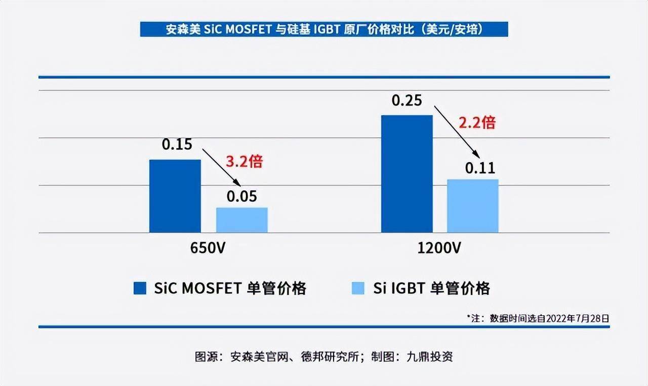 相比之下,硅基器件就便宜多了。美国半导体企业安森美的数据显示,2022年7月28日,在650V产品上,SiC MOSFET的原厂报价,是硅基IGBT的3.2倍。在1200V产品上,前一器件的原厂报价为后者的2.2倍。