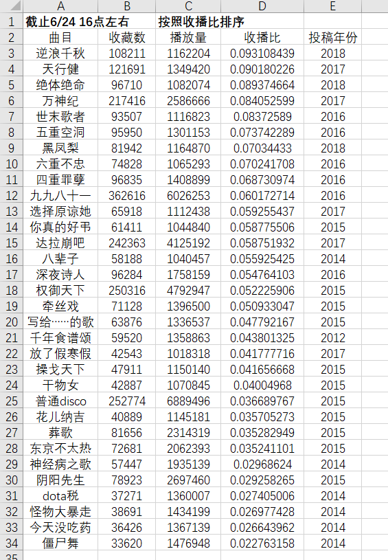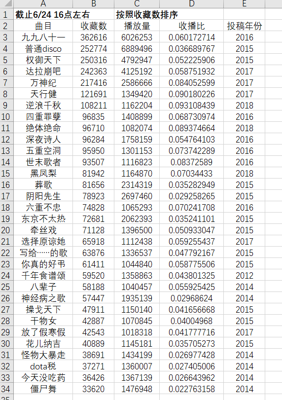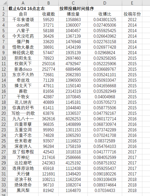 当然我们要考虑的因素还有很多,比如名p效应对收藏量的影响,投稿时间与活动对收藏与播放量的影响,单单一个收播比说明不了太多问题。诸君可能会从这个表格中看出各种各样有趣的现象,这里答主暂且不表,不过至少可以说明一件事: