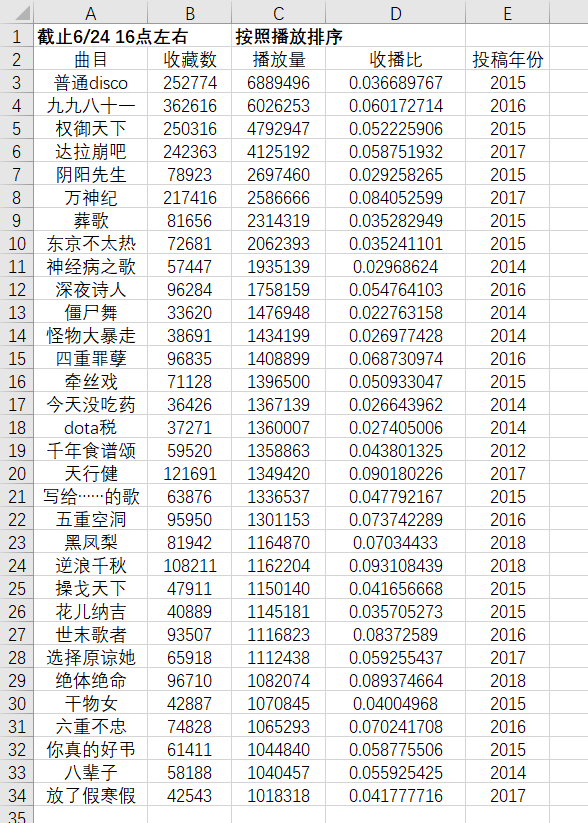 首先,本题主人公,黑凤梨排名第七,算很高的排名了,这个没有什么意料不意料,因为本来就是好奇黑凤梨的数据做了这个表格。倒是看Z新豪的另外两首《东京不太热》《干物女》,排名倒是不佳。
